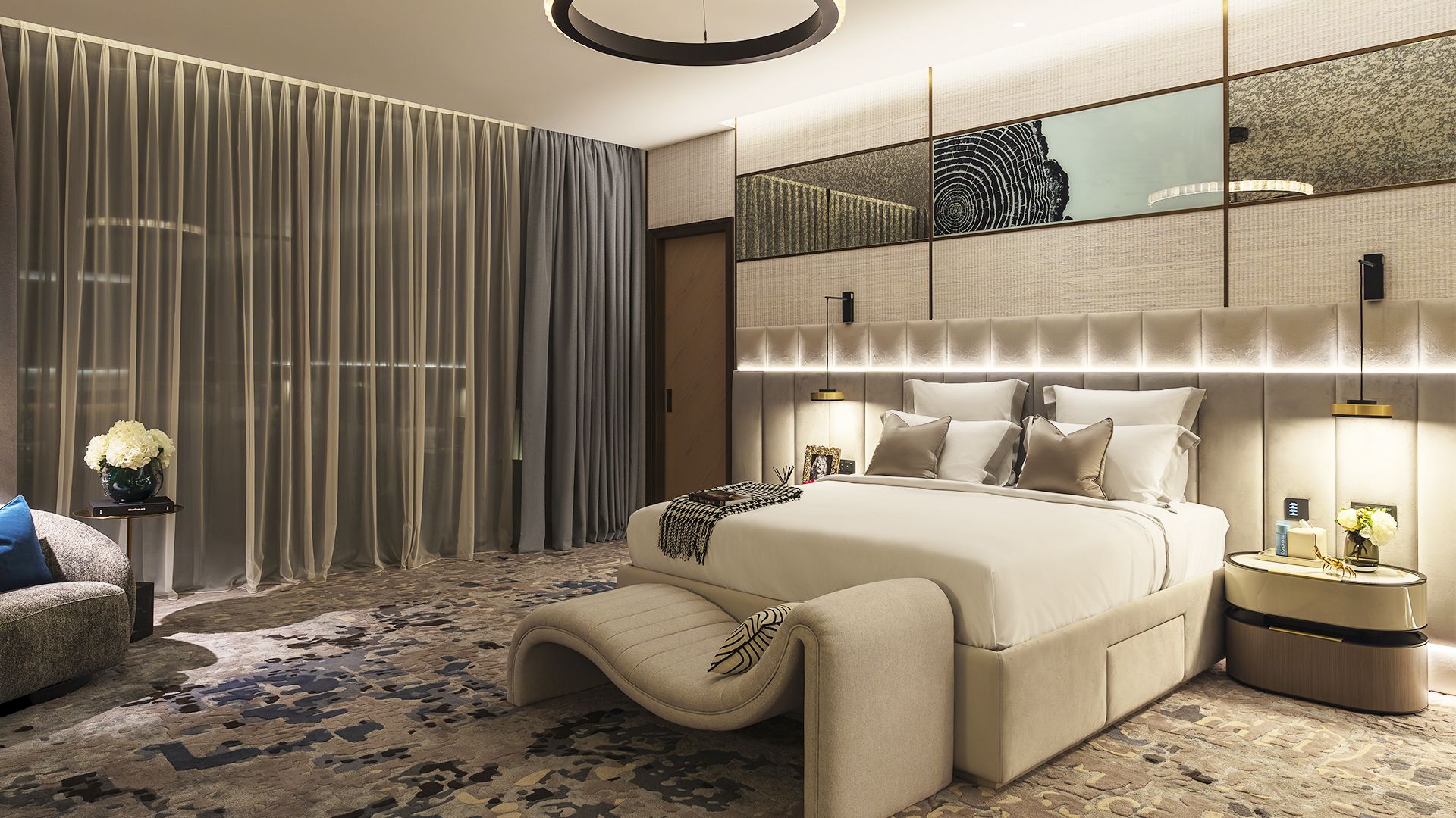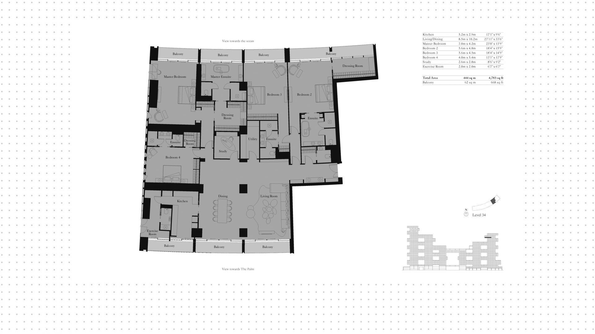Апартаменты с 4 спальнями в комплексе The Royal Atlantis Residences. Апартаменты с площадью 505 м² на 34 этаже из 46, с отделкой. Окна: панорамные. Вид из окон: dual view: palm and sea. Реализация проекта запланирована на 1 квартал 2023 года.