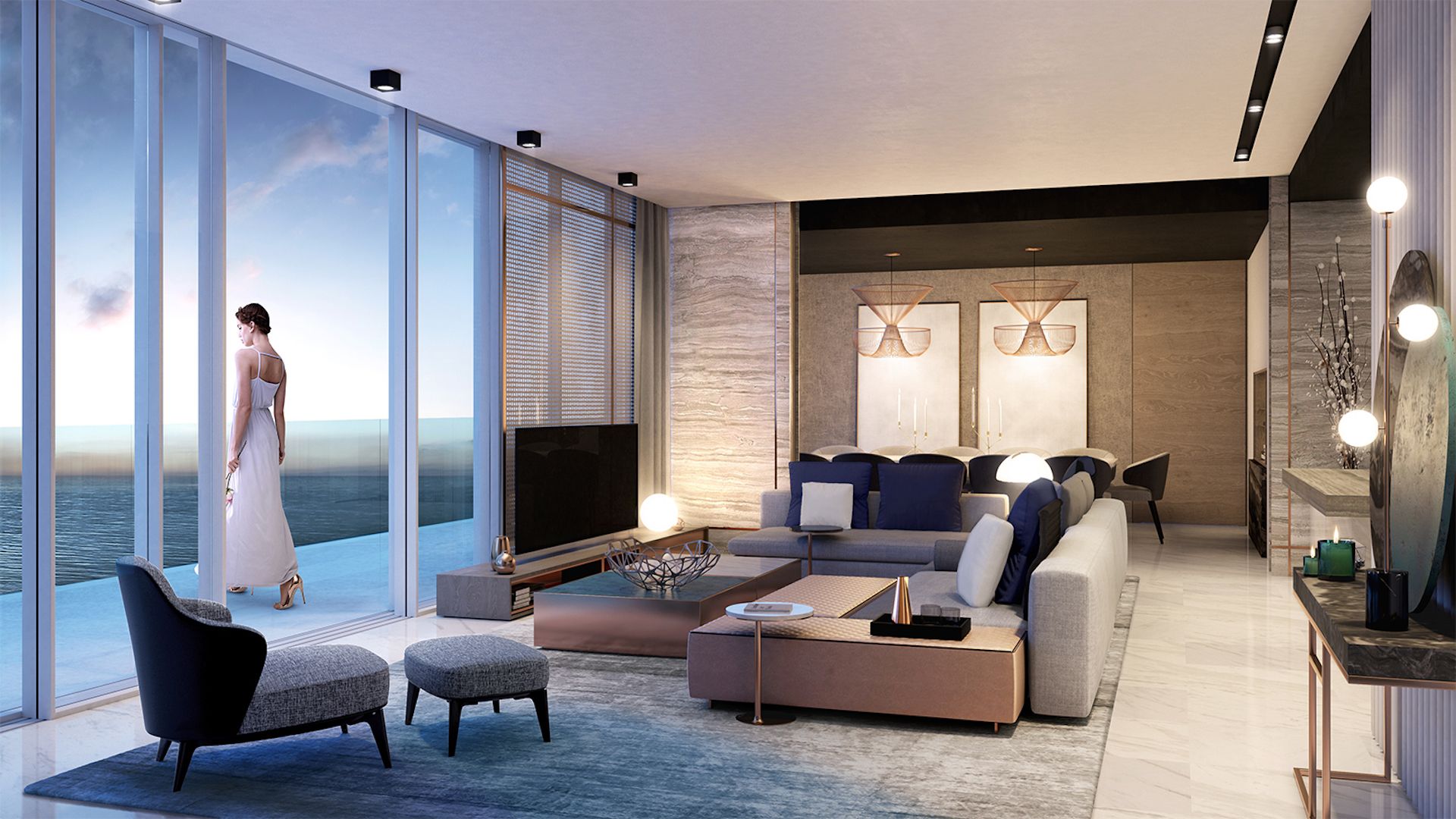 Апартаменты дополнены гостевой туалетной комнатой и подсобным помещением с собственной полностью оборудованной ванной комнатой. Просторные апартаменты мягко переходят в большие террасы, откуда отрываются захватывающие виды на побережье. Двухэтажные пентхаусы дополнены атриумом, частным лифтом в вестибюле и дополнительной кухней, а служебное помещение на первом этаже оборудовано собственной ванной комнатой и отдельным входом.