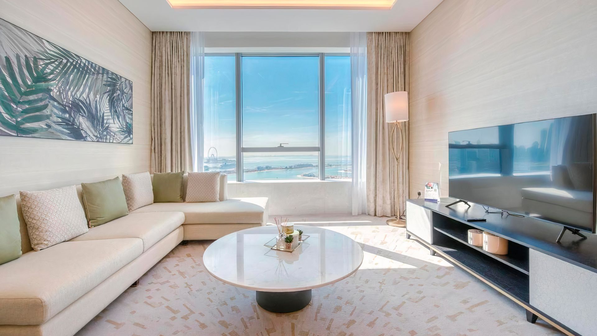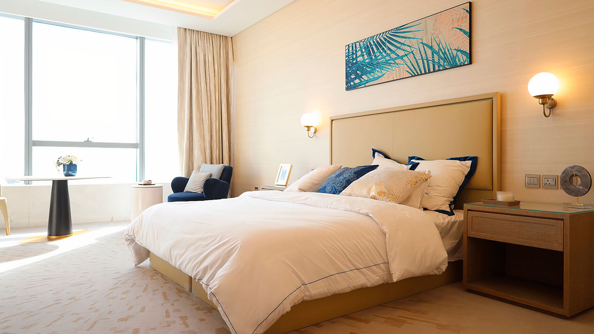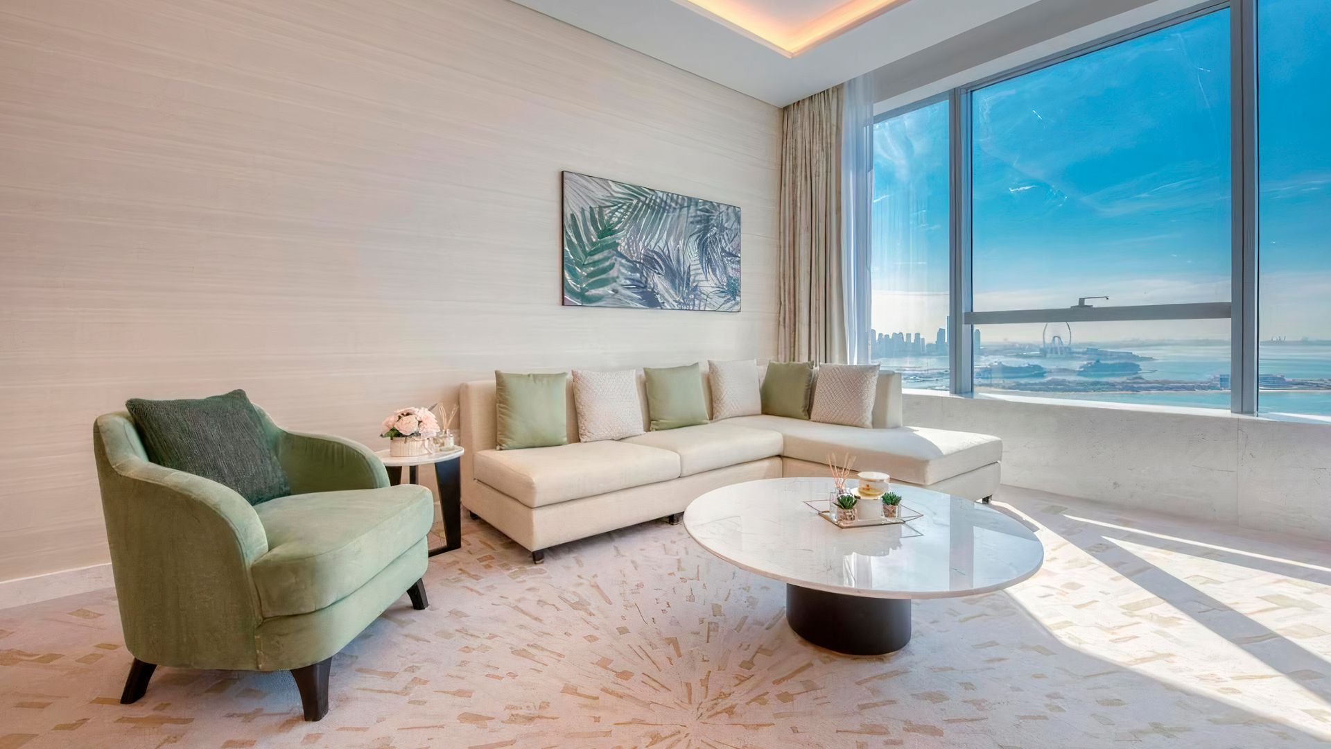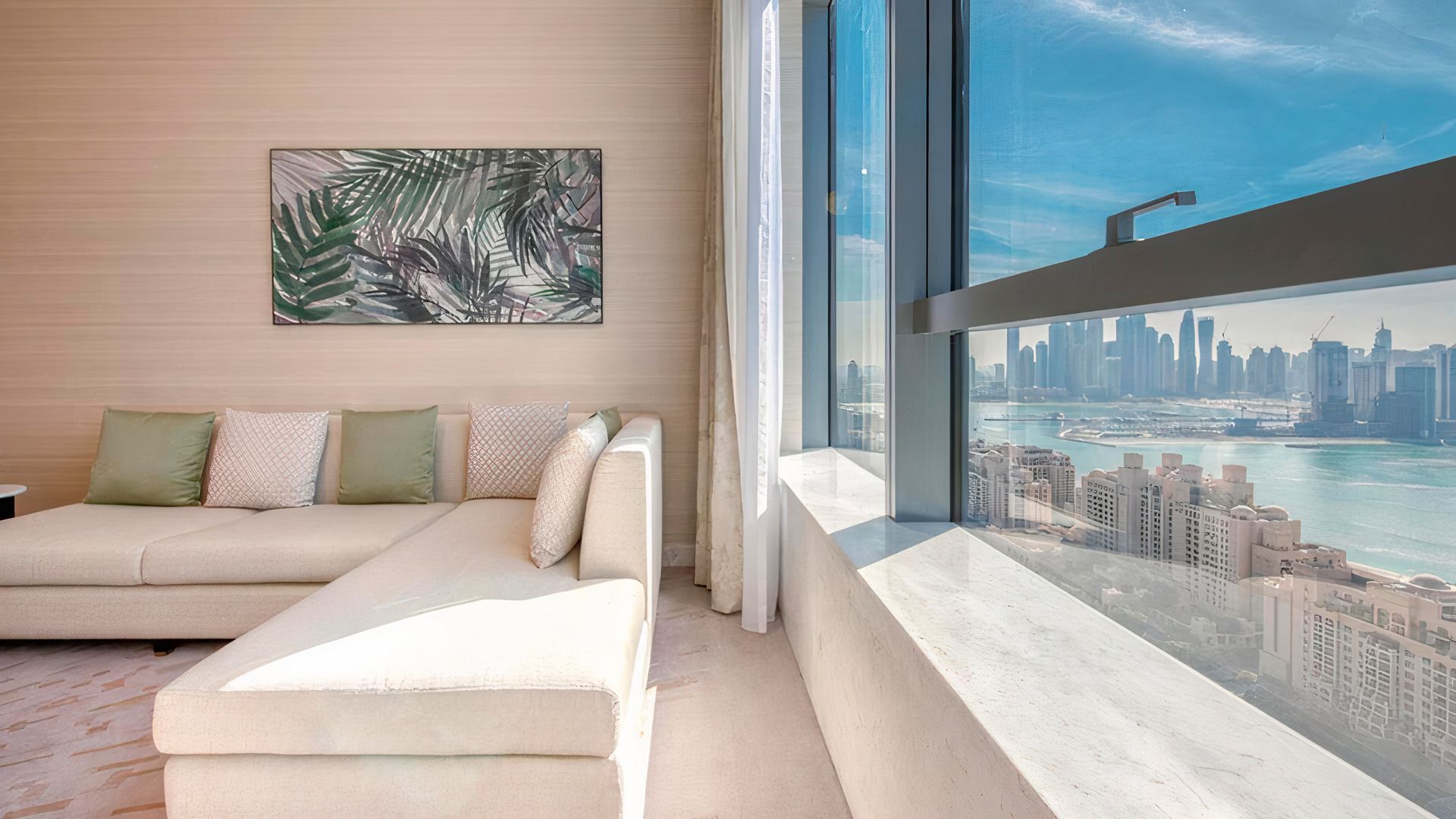 В коллекции проекта The Palm Tower возможно выбрать готовые к проживанию апартаменты с элегантной мебелью и бытовой техникой. Спокойный интерьер выдержан в нежно-бежевых оттенках. Естественный свет проникает сквозь панорамные окна и создает ощущение покоя и расслабленности.