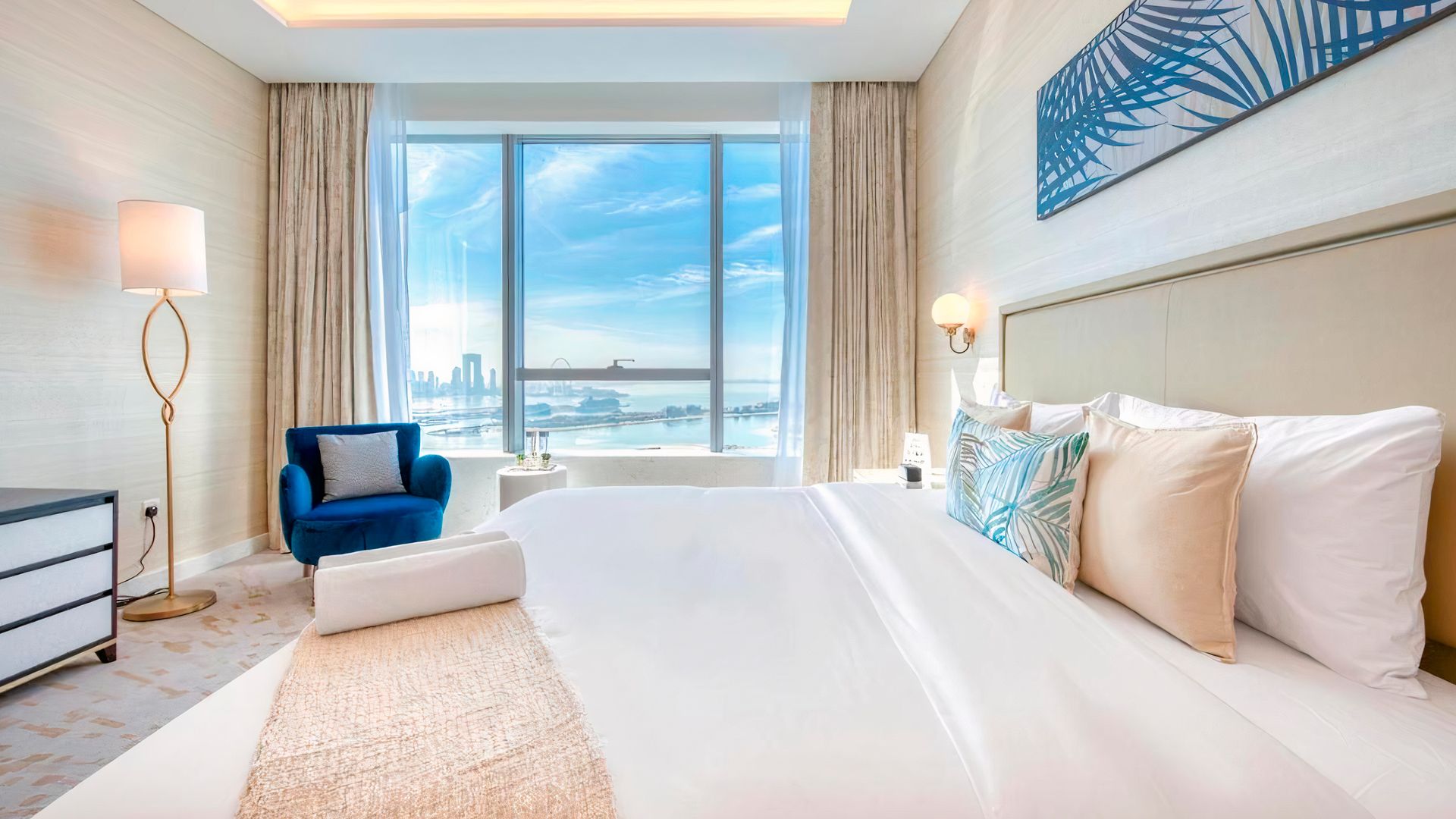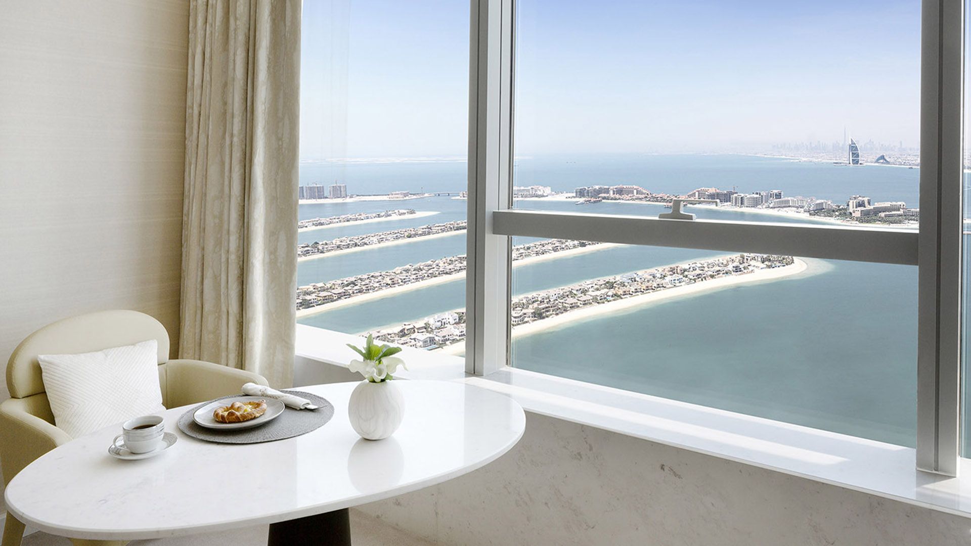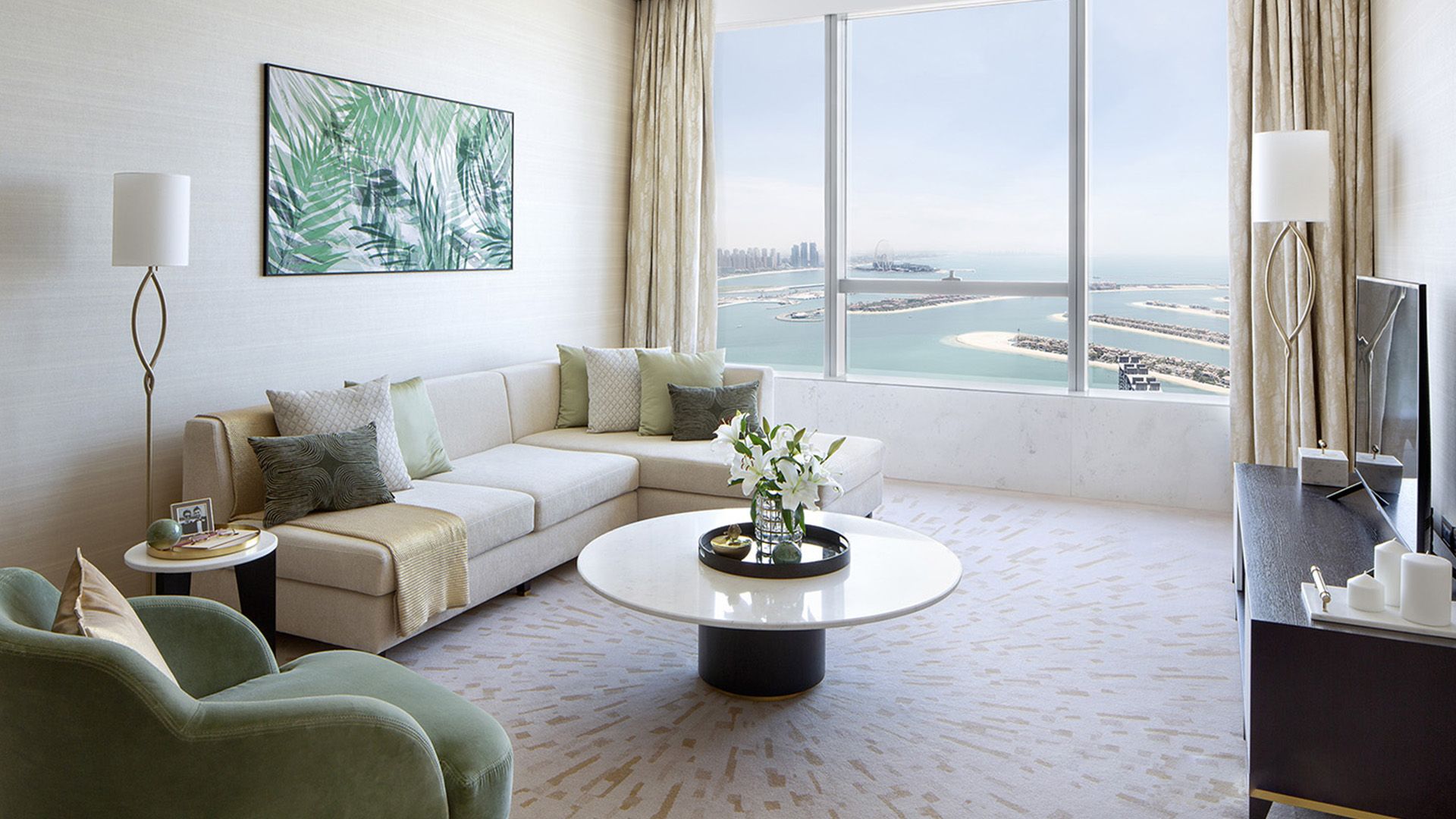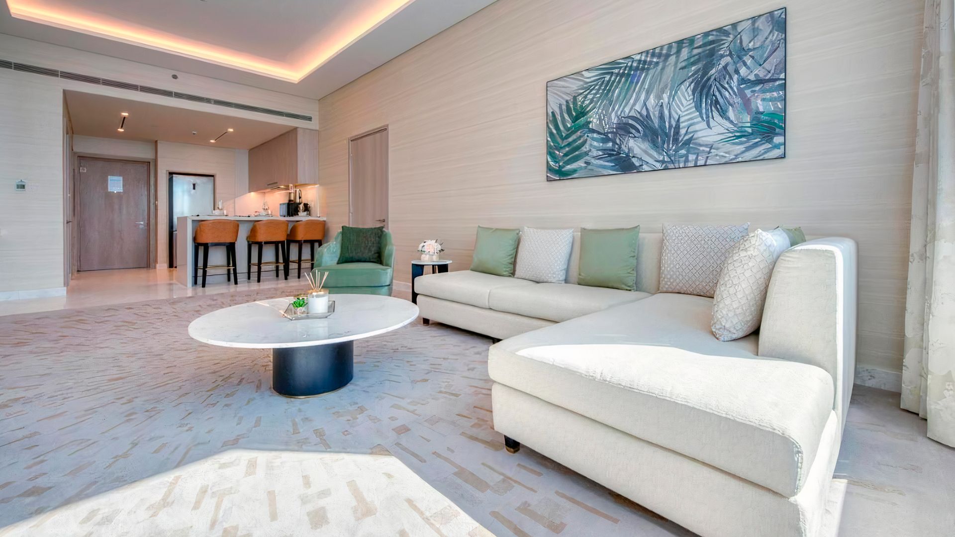 В коллекции проекта The Palm Tower возможно выбрать готовые к проживанию апартаменты с элегантной мебелью и бытовой техникой. Спокойный интерьер выдержан в нежно-бежевых оттенках. Естественный свет проникает сквозь панорамные окна и создает ощущение покоя и расслабленности.
