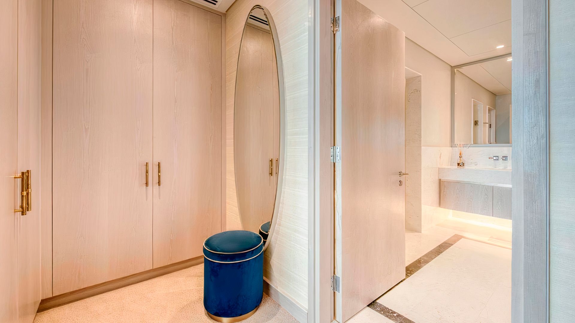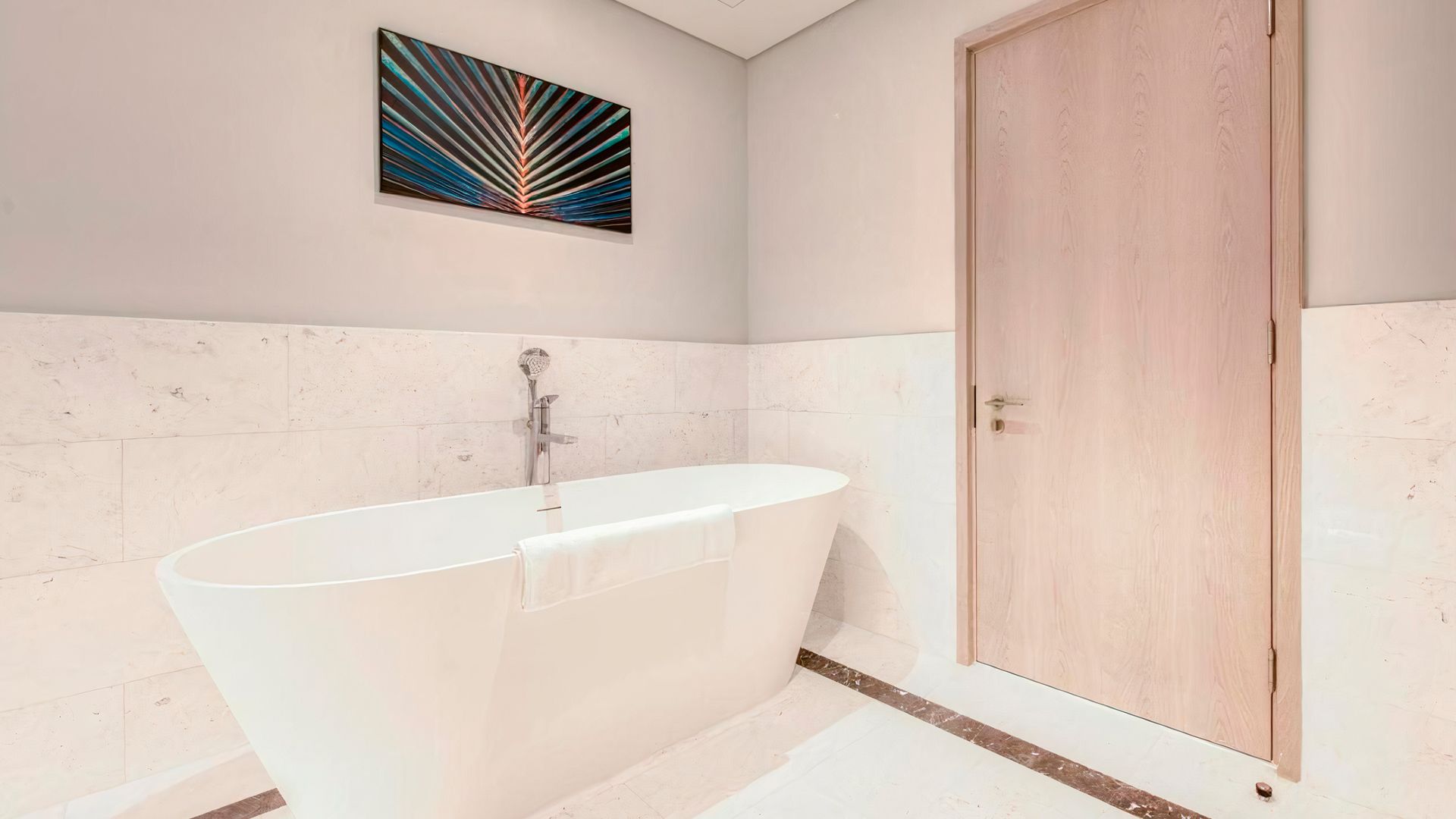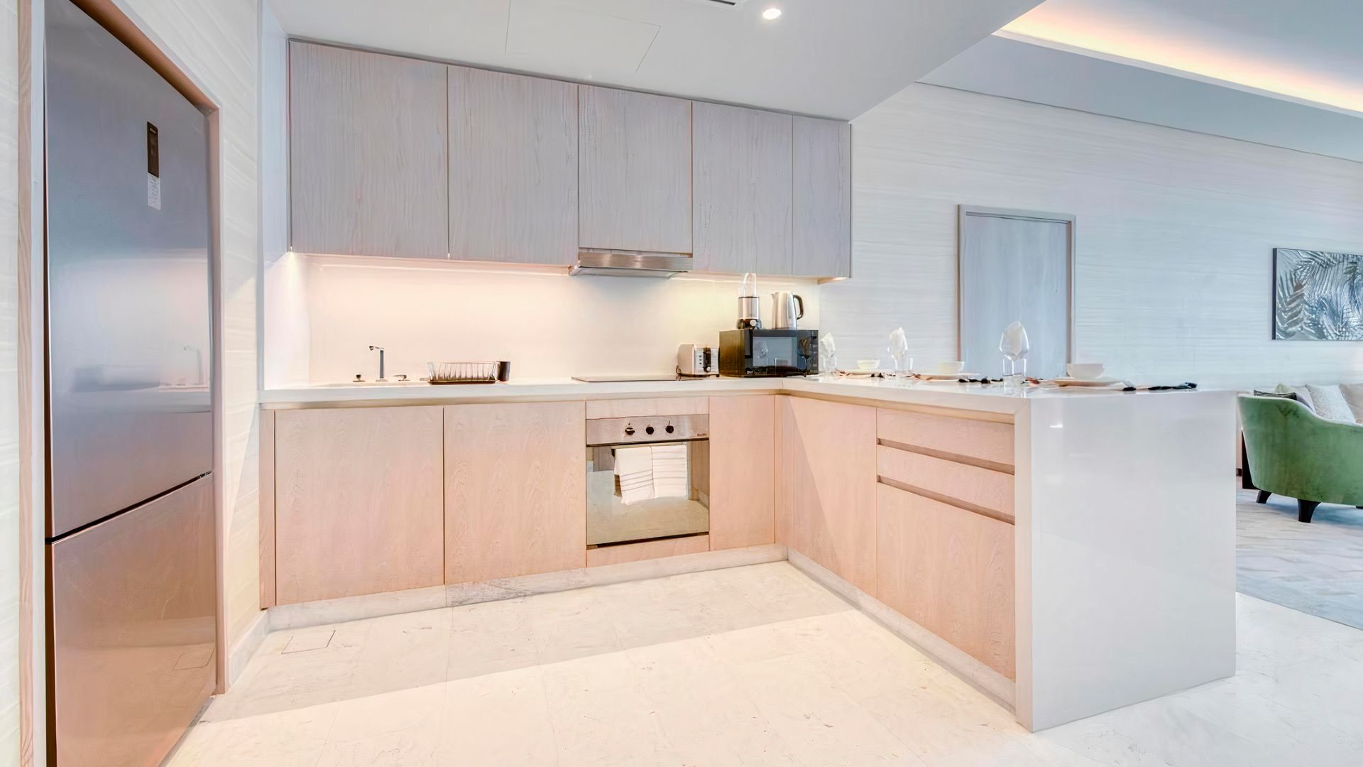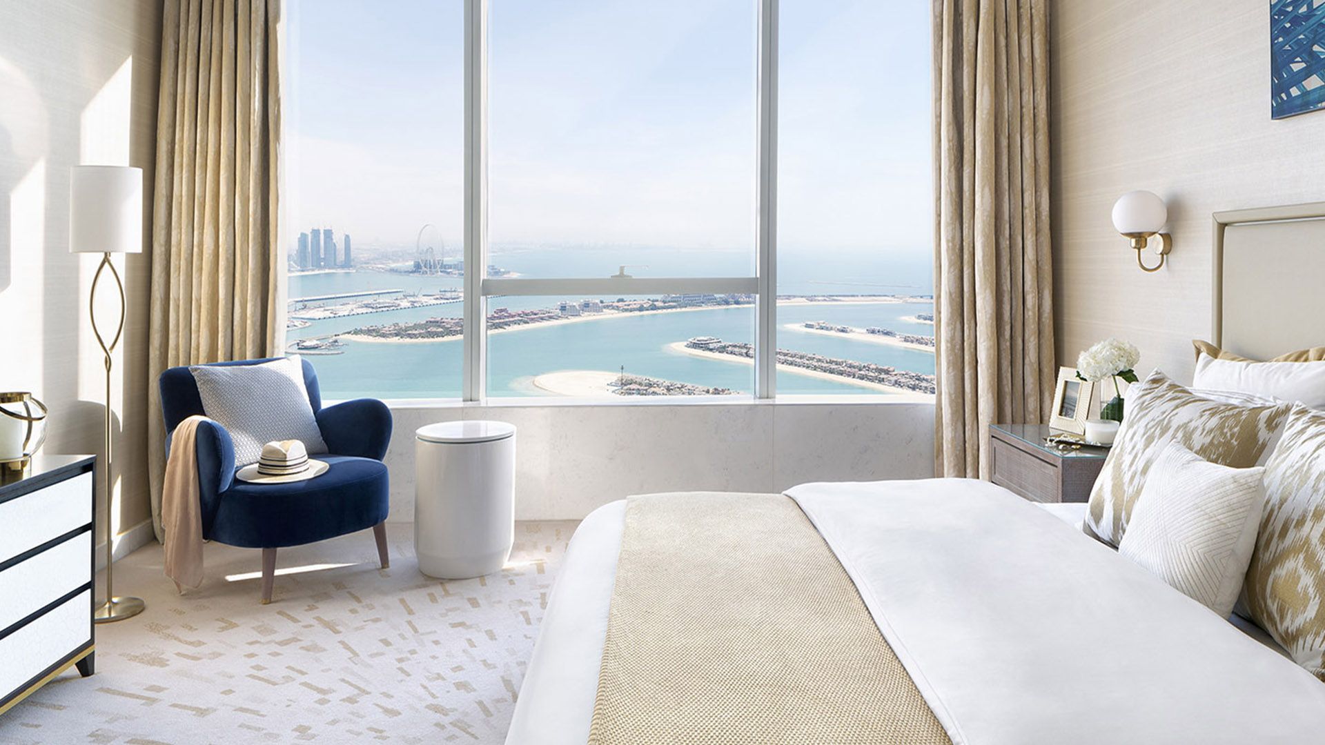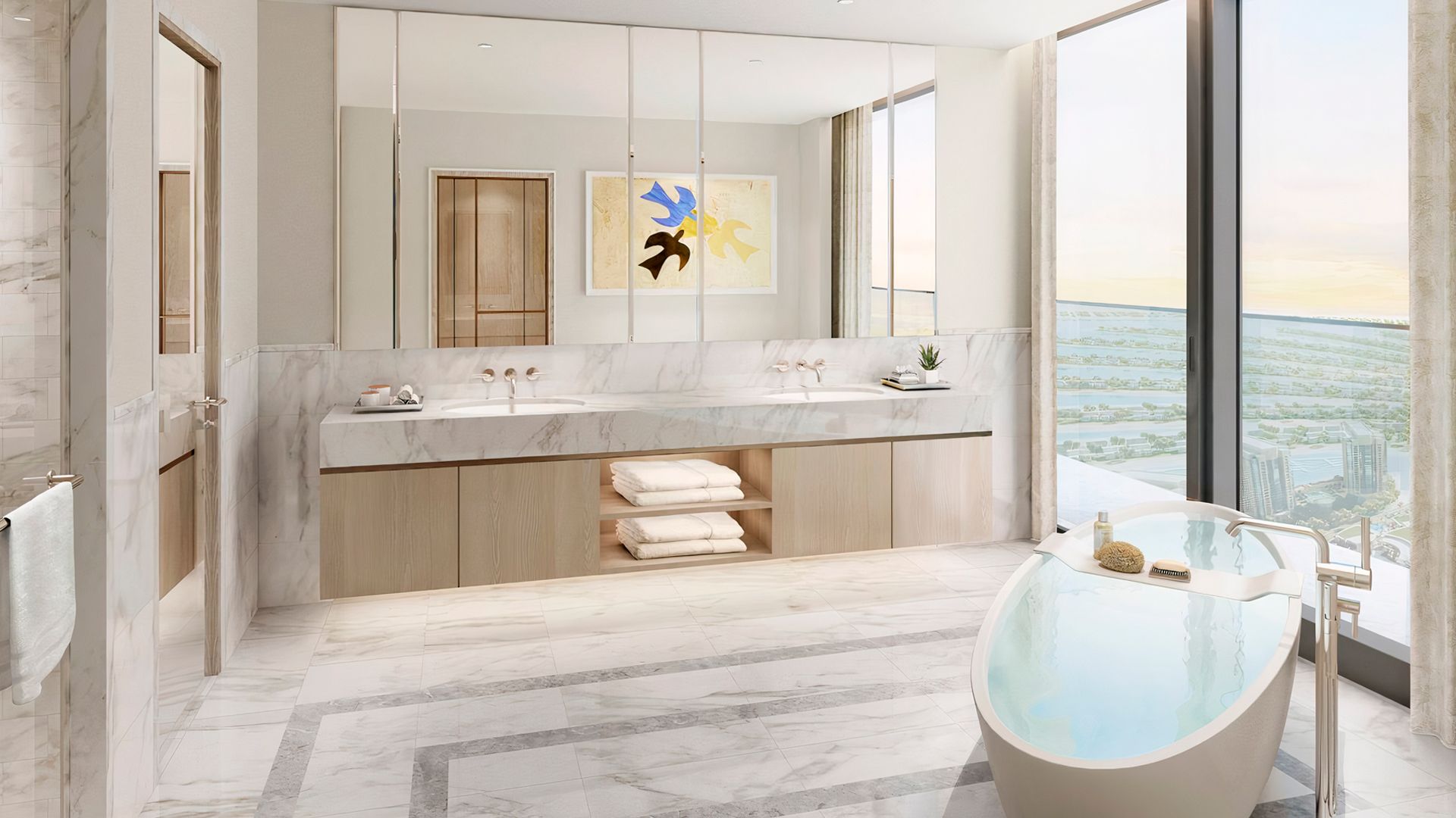 В коллекции проекта The Palm Tower возможно выбрать готовые к проживанию апартаменты с элегантной мебелью и бытовой техникой. Спокойный интерьер выдержан в нежно-бежевых оттенках. Естественный свет проникает сквозь панорамные окна и создает ощущение покоя и расслабленности.