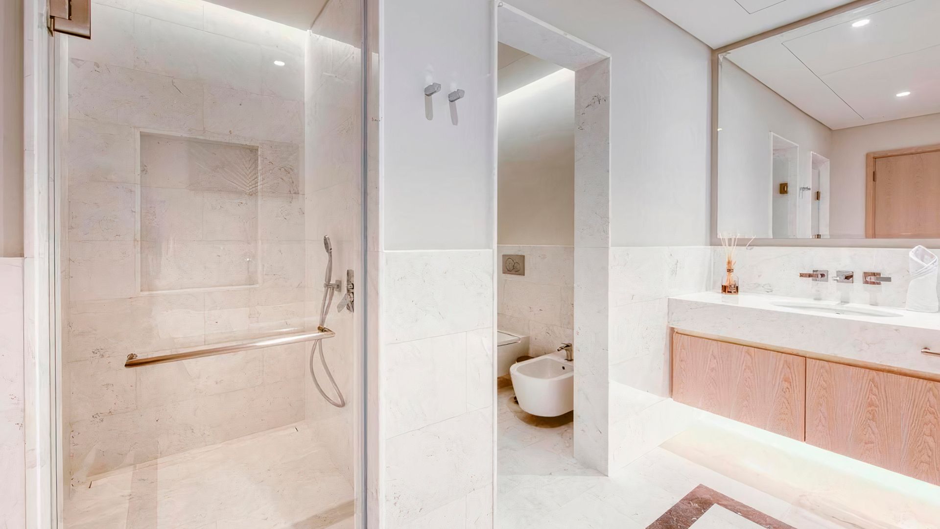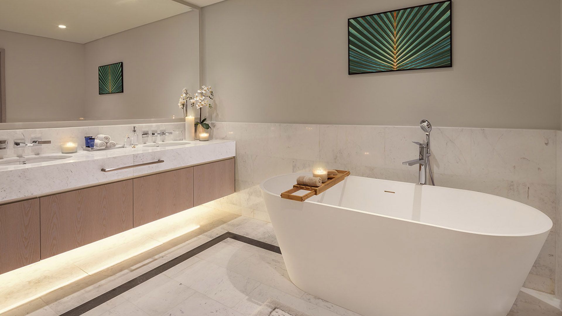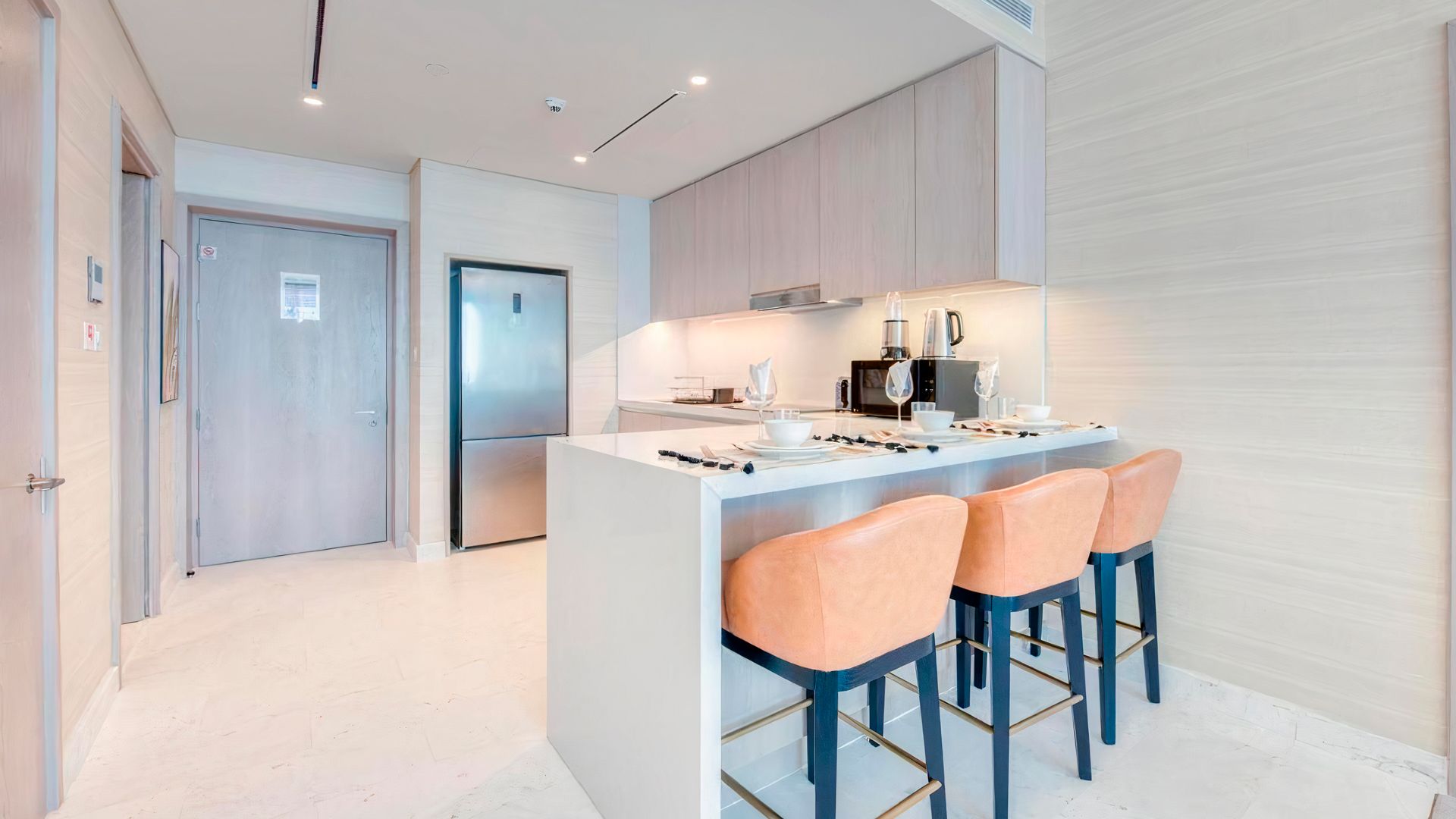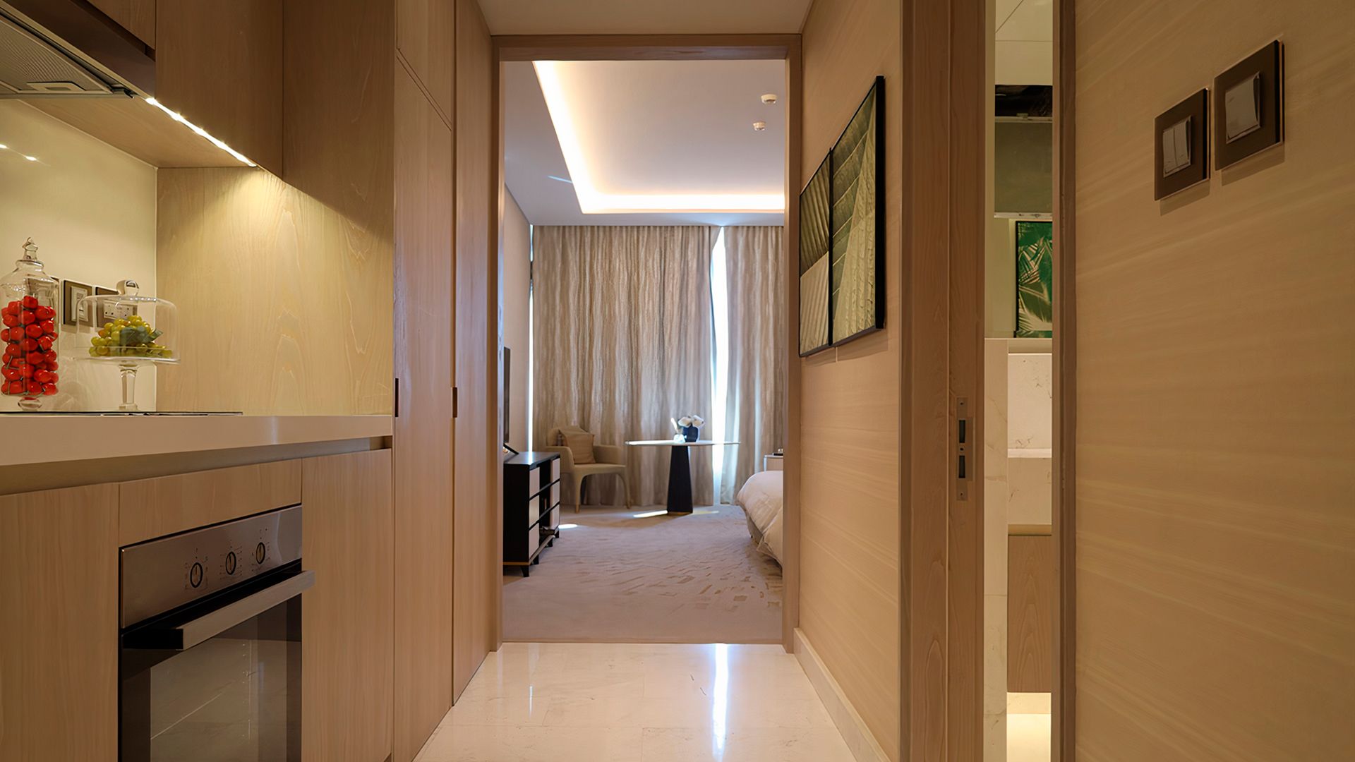 В коллекции проекта The Palm Tower возможно выбрать готовые к проживанию апартаменты с элегантной мебелью и бытовой техникой. Спокойный интерьер выдержан в нежно-бежевых оттенках. Естественный свет проникает сквозь панорамные окна и создает ощущение покоя и расслабленности.