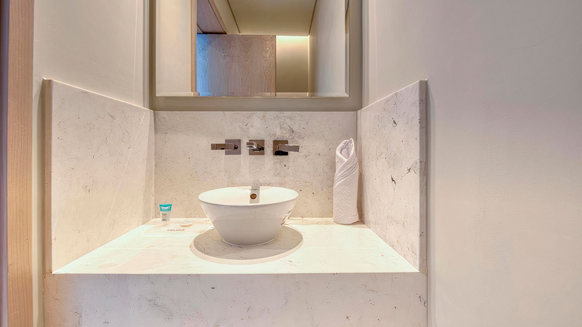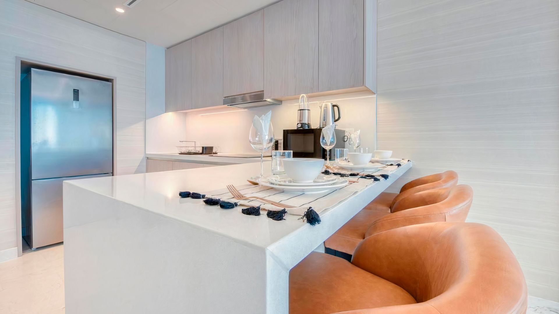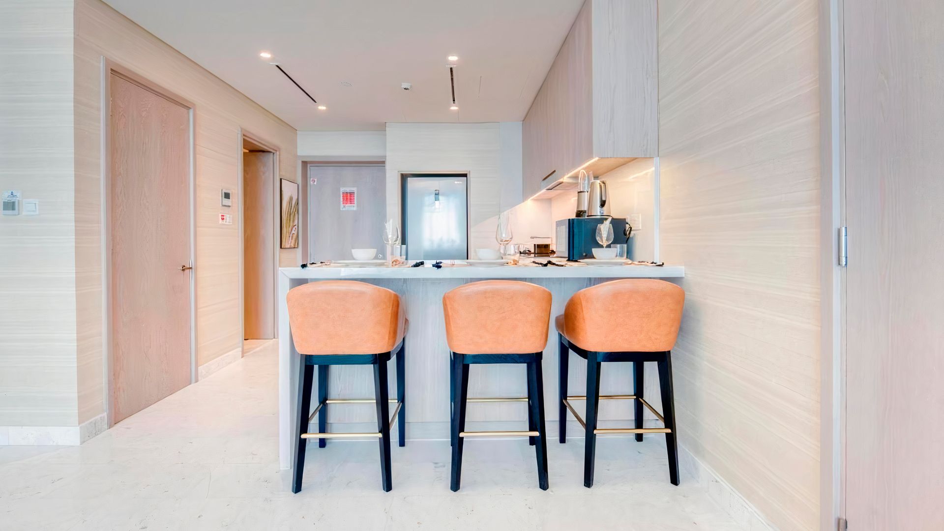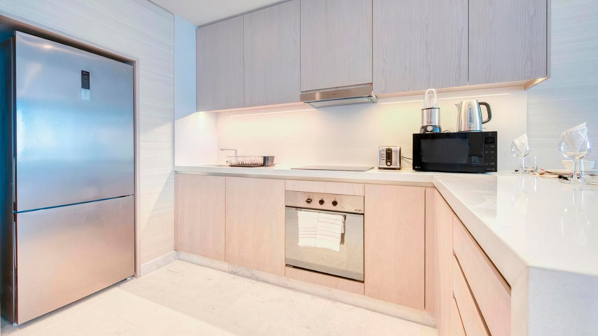 В коллекции проекта The Palm Tower возможно выбрать готовые к проживанию апартаменты с элегантной мебелью и бытовой техникой. Спокойный интерьер выдержан в нежно-бежевых оттенках. Естественный свет проникает сквозь панорамные окна и создает ощущение покоя и расслабленности.